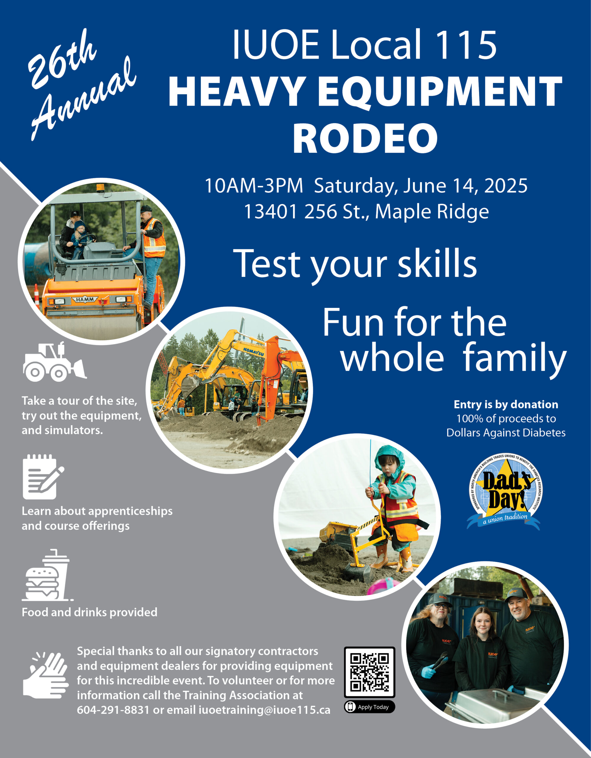 Saturday, June 14 – Heavy Equipment Rodeo To volunteer, call 604-291-8831 or email iuoetraining@iuoe115.ca.